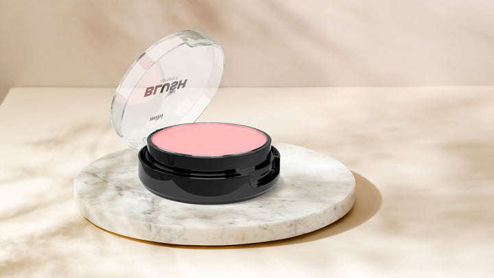 Patogus dėklas su veidrodėliu ir šepetėliu greitam ir lengvam skaistalų užtepimui.