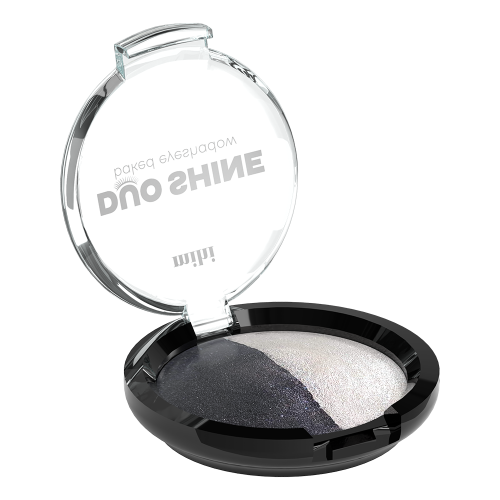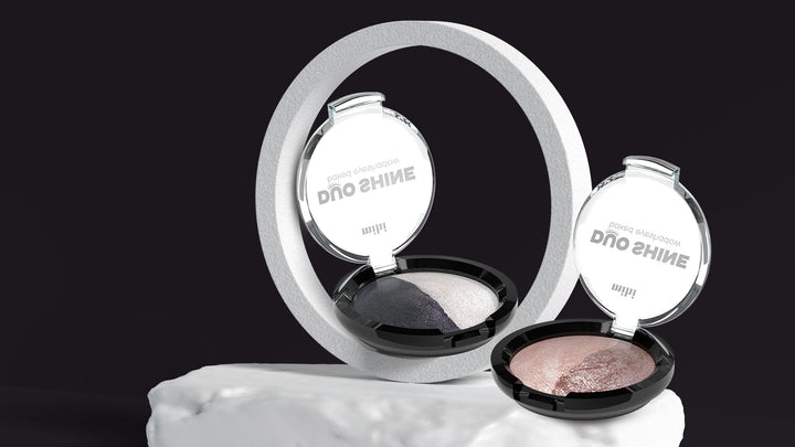 Dviejų klasikinių kontrastingų atspalvių šešėlių paletė su blizgiomis mikrodalelėmis, kad sukurtumėte nuostabų akių makiažą.
